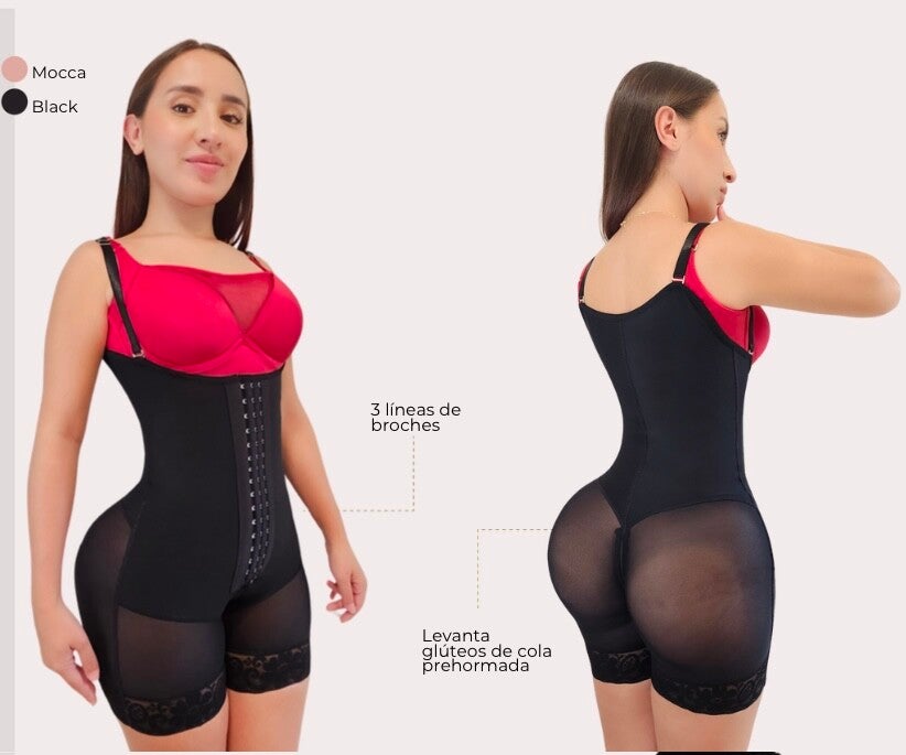 Faja elaborada tela powernet de alta compresión, 3 líneas de broches, cierre perineal, tiras removibles y ajustables, cola prehormada, blondas en piernas de silicona para que no se enrolle.